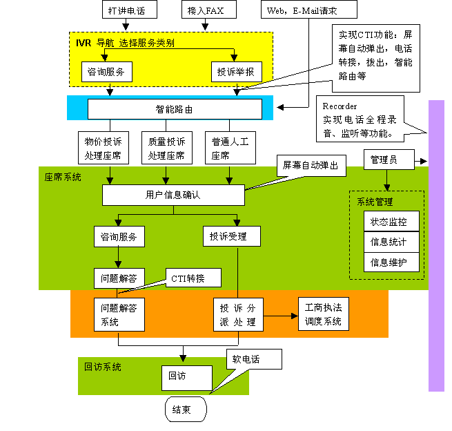 黎明網(wǎng)絡(luò)深入研究世界上最新的CTI技術(shù)的發(fā)展和應(yīng)用,自主研發(fā)推出的12315消費者投訴受理系統(tǒng)采用當(dāng)前主流的一體化的呼叫中心模式。一體化的呼叫中心模式具有投資少、易于實施、維護工作量較小、維護成本低的優(yōu)點。該系統(tǒng)建立在內(nèi)部以太網(wǎng)基礎(chǔ)上,不同網(wǎng)絡(luò)(PSTN網(wǎng)、IP網(wǎng)、GSM/GPRS/CDMA網(wǎng))的消費者可以通過多種方式(電話、傳真、E-mail、短消息等)接入12315系統(tǒng),利用系統(tǒng)提供的服務(wù)進行投訴舉報或咨詢。
