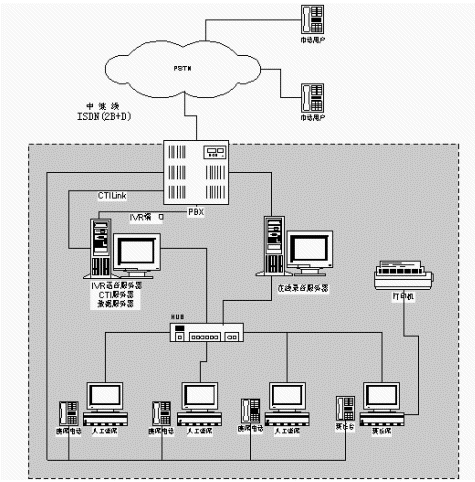 一臺Siemens Hipath交換機:接入16條(2B+D)ISDN中繼線,設置人工座席分機,為CTI、IVR語音服務器提供8路IVR端口。