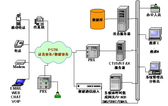- 采用國(guó)內(nèi)外高性能程控交換機(jī),具有標(biāo)準(zhǔn)CTI接口。