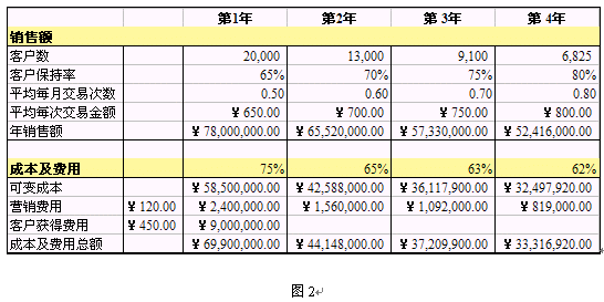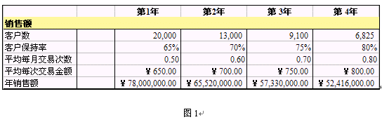 第1年,平均每個客戶每個月交易的次數(shù)是0.50次,平均每次的交易金額是¥650.00,因此第1年的銷售額是¥650.00*(0.5次/月*12個月)*20,000 = ¥78,000,000.00。隨著時間的推移,保留下來的老客戶平均每個月的交易次數(shù)逐步從0.50次上升到0.80次,而且每次采購的金額也逐步從¥650.00提高到¥800.00;但是由于這一組客戶的數(shù)量不斷減少,年銷售額逐步從¥78,000,000.00下降到了¥52,416,000.00。
