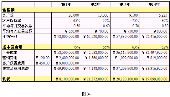 如圖3所示,將各年的銷售額分別減去成本及費用,就得到各年度的利潤額。我們發(fā)現(xiàn)這一組客戶貢獻的利潤,從第1年的¥8,100,000.00到第2年的¥21,372,000.00,有顯著上升;利潤在第2年達到頂點后,逐年緩慢下降,下降的幅度比較小。