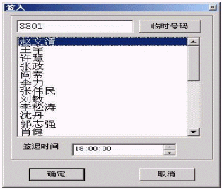 當(dāng)公司外出員工回到單位以后,在公司前臺的訂席系統(tǒng)操作臺上按"簽入"鍵;屏幕上將顯示工位的分布及占用情況;按相應(yīng)的工位后,屏幕將顯示輸入信息的菜單,輸入相應(yīng)的信息后,按"確定"按鈕,如下圖: