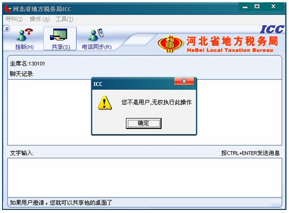 7. 遠(yuǎn)程共享:考慮到對納稅人電腦的安全保護(hù),座席端沒有權(quán)利主動共享納稅人的桌面,即坐席不能點擊共享按鈕,如果點擊,將彈出對話框友好提示:“您不是納稅人,無權(quán)執(zhí)行此操作”如下圖: