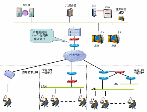 中國互聯(lián)網(wǎng)現(xiàn)狀:由于IP地址的匱乏,中國互聯(lián)網(wǎng)基本上是公網(wǎng)、私網(wǎng)同時并存,并且私網(wǎng)和公網(wǎng)之間經(jīng)常使用防火墻隔離;同時,呼叫中心的座席計算機(jī)一定處在一個私網(wǎng)內(nèi)。形式如下: