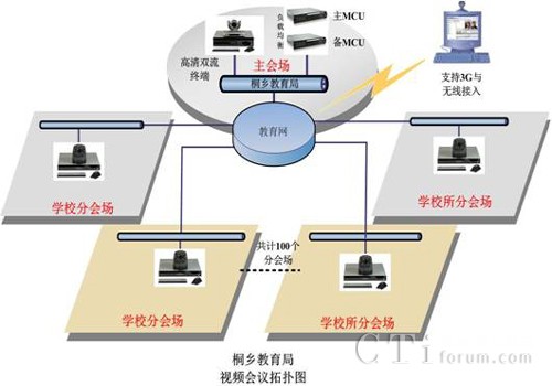 作為浙江省的教育強(qiáng)市,桐鄉(xiāng)市教育局下屬有各級(jí)各類學(xué)校近百所,隨著學(xué)校規(guī)模的日益擴(kuò)大,以及教育信息化進(jìn)程的推進(jìn),桐鄉(xiāng)教育局需要構(gòu)建遠(yuǎn)程教學(xué)交流平臺(tái),以實(shí)現(xiàn)資源共享。項(xiàng)目要求構(gòu)建的遠(yuǎn)程教學(xué)交流平臺(tái)能夠使教育局與各學(xué)校之間實(shí)現(xiàn)點(diǎn)對(duì)點(diǎn)、一點(diǎn)對(duì)多點(diǎn)、和多點(diǎn)群組視頻會(huì)議、遠(yuǎn)程課堂、課堂觀摩、互通教學(xué)等多種應(yīng)用。并且滿足以下需求: