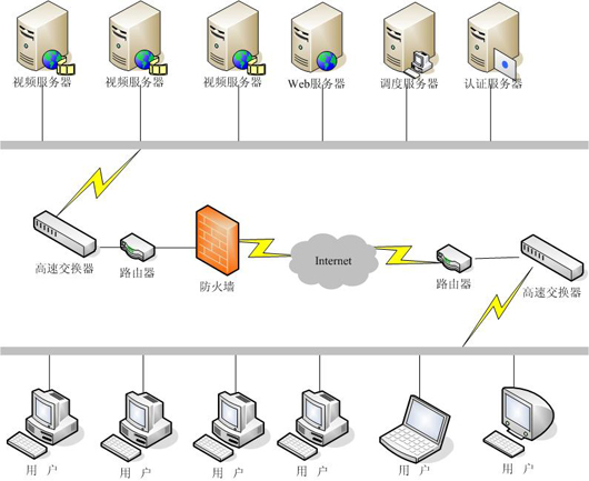 考慮到在線點(diǎn)播的用戶為1000并發(fā),所以使用一臺(tái)服務(wù)器就可以滿足需求了,客戶可以通過認(rèn)證后,經(jīng)客戶經(jīng)過調(diào)度服務(wù)器將請求反饋給視頻服務(wù)器,完成視頻點(diǎn)播流程,具體架構(gòu)如圖。