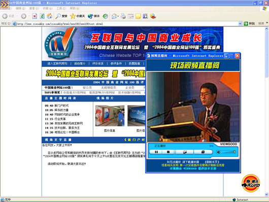 作為此次活動(dòng)全程流媒體直播技術(shù)提供商VIEWGOOD(www.viewgood.com)商務(wù)主管在活動(dòng)現(xiàn)場(chǎng)說:“中國大陸的上網(wǎng)用戶總?cè)藬?shù)即將突破1億,中外商業(yè)網(wǎng)站的資本運(yùn)作空前活躍,3G、IPv6等新技術(shù)將催生互聯(lián)網(wǎng)的新一輪變革,網(wǎng)絡(luò)媒體正在從“第四媒體”快速走向“第一媒體”,致力為中國互聯(lián)網(wǎng)媒體服務(wù)的VIEWGOOD和所有的網(wǎng)站一樣,既面臨著激烈的挑戰(zhàn),更面臨著難得的發(fā)展機(jī)遇。無論是成長最快的網(wǎng)站、最具潛力的網(wǎng)站,還是創(chuàng)新最佳的網(wǎng)站,都是VIEWGOOD的合作伙伴。我們將以國際最先進(jìn)的流媒體技術(shù)服務(wù)于中國互聯(lián)網(wǎng)。”