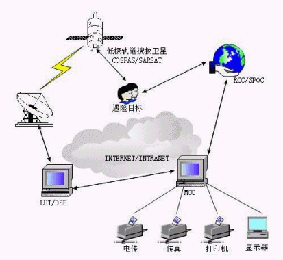 當(dāng)用戶(船舶、飛機(jī)或個(gè)人)遇險(xiǎn)后,遇險(xiǎn)示位信標(biāo)可以通過人工或者自動(dòng)由遇險(xiǎn)時(shí)的撞擊、水浸而激活(信標(biāo)激活后可以存活48/小時(shí)),發(fā)出121.5MHz/243MHz/4O6MHz的遇險(xiǎn)報(bào)警信號(hào),搜救衛(wèi)星則對(duì)遇險(xiǎn)示位信標(biāo)發(fā)出的遇險(xiǎn)報(bào)警信號(hào)進(jìn)行變頻、存儲(chǔ)、轉(zhuǎn)發(fā)等處理并轉(zhuǎn)發(fā),由幾個(gè)數(shù)據(jù)信號(hào)處理器(DSP)對(duì)衛(wèi)星的下行信號(hào)中的121.5MHz、243MHz、406MHz信號(hào)進(jìn)行實(shí)時(shí)處理或?qū)?06MHz信號(hào)進(jìn)行延時(shí)處理。由遍布全球的地面處理分系統(tǒng)本地用戶終端(LUT)接收并計(jì)算出遇險(xiǎn)目標(biāo)的位置,把信標(biāo)的報(bào)警數(shù)據(jù)和統(tǒng)計(jì)信息送給相應(yīng)的搜救任務(wù)控制中心(MCC)。 MCC采用主/備雙機(jī)結(jié)構(gòu)運(yùn)行,收集、整理、儲(chǔ)存和分類從LUT與其它MCC送來的數(shù)據(jù),過濾虛假報(bào)警,解除模糊值,通過X.25分組交換、AFTN航空專用通信網(wǎng)、Telex電傳和FAX傳真四種接口,與國際通信網(wǎng)聯(lián)接,以最快的速度把報(bào)警和定位數(shù)據(jù)分發(fā)到有關(guān)的搜救協(xié)調(diào)中心(RCC)或搜救協(xié)調(diào)點(diǎn)(SPOC),使遇險(xiǎn)者能夠得到及時(shí)有效的救助,從而實(shí)現(xiàn)海、陸、空全球全天候衛(wèi)星搜救服務(wù)。