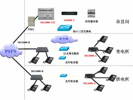 在各級(jí)變電所部署用戶(hù)駐地網(wǎng)關(guān)MG3000-A和智能路由網(wǎng)關(guān)MG3000-R,網(wǎng)關(guān)通過(guò)10/100Base-T以太網(wǎng)接口連接IP網(wǎng)絡(luò),支持多路并發(fā)的VOIP呼叫,在提供數(shù)據(jù)接入的同時(shí),成功的實(shí)現(xiàn)各級(jí)單位的語(yǔ)音業(yè)務(wù)的接入。