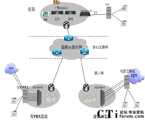 在有PBX監(jiān)獄部署智能路由網(wǎng)關(guān)MG3000-R32(或者數(shù)字中繼網(wǎng)關(guān)MG3000-T4),網(wǎng)關(guān)通過10/100Base-T以太網(wǎng)接口連接IP網(wǎng)絡(luò),注冊(cè)到軟交換平臺(tái)通過路由匯接,成功的把全省各監(jiān)獄的內(nèi)部電話互連互通起來。