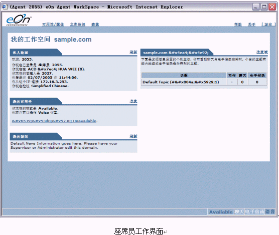 用戶在第一次登陸時,在IE的地址欄中正確鍵入WorkSpace的IP地址便可以進入WorkSpace的歡迎頁面。在該頁面上顯示有座席員工作空間(Agent WorkSpace)、座席班長工作空間(Supervisor WorkSpace)和管理員工作空間(Administrator WorkSpace)等幾個不同指向的鏈接。供聯(lián)絡中心的座席員、座席班長和管理員分別使用。
