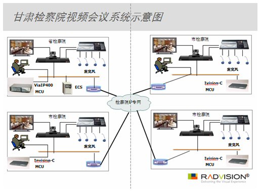 為進(jìn)一步提高檢察系統(tǒng)的工作效率,甘肅省人民檢察院已經(jīng)在其現(xiàn)有網(wǎng)絡(luò)的基礎(chǔ)上建設(shè)覆蓋全省范圍的檢察院專用網(wǎng),并致力于在網(wǎng)絡(luò)內(nèi)建成集領(lǐng)導(dǎo)決策、業(yè)務(wù)處理、信息通訊等為一體的信息管理與服務(wù)的綜合業(yè)務(wù)系統(tǒng)和信息系統(tǒng)資源庫,從而建立起一整套可確保全省人民檢察院工作信息化實(shí)施和發(fā)展的機(jī)制,提高全省檢察機(jī)關(guān)的辦公、辦案效率,為檢察機(jī)關(guān)全面履行法律賦予的職能提供技術(shù)保障。RADVISION視頻會議系統(tǒng)正是這個(gè)宏大計(jì)劃的重要組成部分。
