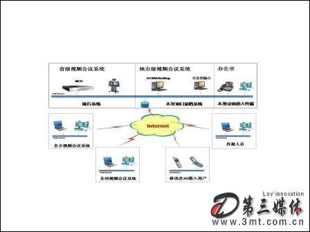 此外,為保證外出領(lǐng)導(dǎo)或員工不會(huì)錯(cuò)過任何一次重要會(huì)議,該套系統(tǒng)需要支持與普通電話、手機(jī)等語音終端的實(shí)時(shí)接入,而專網(wǎng)外計(jì)算機(jī)桌面終端地接入,可保證外出的干部能夠通過普通計(jì)算機(jī)參加重要會(huì)議或培訓(xùn)。該平臺(tái)還要能夠通過升級(jí)支持3G技術(shù)的接入,從而使整套系統(tǒng)能夠順應(yīng)未來通訊技術(shù)的發(fā)展。
