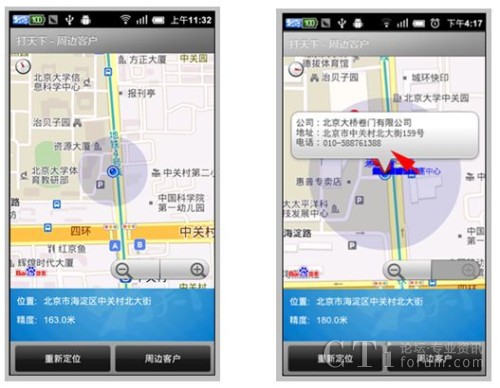 其二,打天下2.0新增了LBS的服務(wù)功能,原有的打天下只能實(shí)現(xiàn)拍照上傳、簽到等簡(jiǎn)單功能應(yīng)用,而新版本則可以提供check的位置服務(wù),通過check可以在地圖上顯示標(biāo)記地點(diǎn)周邊分布的客戶地理位置信息,極大方便了外勤員工的路線制訂。