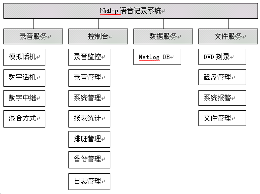 NetLog語音記錄系統(tǒng)采用基于分布式、多層控制管理體系的設(shè)計思想,將電話線路與內(nèi)部網(wǎng)絡(luò)有效地結(jié)合在一起,形成一套完整的語音錄制、管理系統(tǒng)。采用目前先進的C/S模型,能更方便、快捷地實現(xiàn)控制臺對網(wǎng)絡(luò)內(nèi)所有記錄服務(wù)的狀態(tài)監(jiān)視,記錄查詢,操作控制等,采用統(tǒng)一的管理化機制,使文件的管理和備份更簡潔。