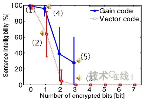 該系統(tǒng)的信息量會隨bit數(shù)分割的多少大幅度改變。比方說,如果將LD-CELP轉(zhuǎn)換出的10bit數(shù)字音頻數(shù)據(jù)全部分割,在2路徑發(fā)送的情況下,信息量會增加到4倍的40bit”(NEC)。為了在提高通話保密性的同時(shí),將分散產(chǎn)生的信息量控制到最少,“在音頻數(shù)據(jù)中,只有人類聽覺比較敏銳的部分會被分割”(NEC)。