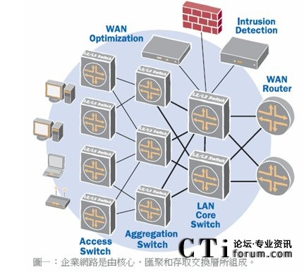 復(fù)雜的網(wǎng)絡(luò)拓?fù)?/b>:網(wǎng)絡(luò)架構(gòu)因內(nèi)含龐雜的多層網(wǎng)絡(luò),而變得越來(lái)越復(fù)雜。目前多數(shù)企業(yè)網(wǎng)絡(luò)都是三層式拓?fù),包括?shù)據(jù)匯聚層或分發(fā)層。許多網(wǎng)絡(luò)都已部署了匯聚交換機(jī),以彌補(bǔ)傳統(tǒng)存取及核心交換機(jī)欠缺高速光纖接口的缺陷,以便支持直接的連接。有些企業(yè)甚至建立了第四層網(wǎng)絡(luò),由連接到核心交換機(jī)的核心路由器組成。這樣的網(wǎng)絡(luò)架構(gòu)雖然可以發(fā)揮一定的作用,但卻大幅增加了資本支出,造成操作流程過(guò)于復(fù)雜,并為管理帶來(lái)沉重負(fù)擔(dān)。此外,這類架構(gòu)也會(huì)增加網(wǎng)絡(luò)的等待時(shí)間,并導(dǎo)致超額負(fù)載的情況出現(xiàn),因而降低了應(yīng)用效能。