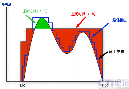如果僅僅是工作量大,我想排班員還能夠忍受,更要命的是,排出的班表不能做到精確。要么人員太多,導(dǎo)致運(yùn)營成本上升;要么人員不夠,無法達(dá)到預(yù)期的服務(wù)目標(biāo)。以呼叫中心典型的雙峰曲線為例(如右圖),排班所追求的是人力安排和話務(wù)曲線的盡可能吻合(也就是圖中藍(lán)色的最佳排班線),達(dá)到在滿足服務(wù)水平的基礎(chǔ)上盡可能少的安排座席資源。而在手工排班中,由于大量的采用組排班,組中成員同時(shí)上下班、同時(shí)午餐,導(dǎo)致人力安排的靈活性降低,不能盡可能的去擬合話務(wù)曲線。此外,參考前面談到的影響人力安排的因素,手工排班中考慮了環(huán)境的影響,部分考慮了縮減,但座席技能因素考慮很少,基本認(rèn)為所有人員的技能熟練度一致,不可預(yù)見性縮減也沒有考慮進(jìn)去,導(dǎo)致最終會對服務(wù)水平造成負(fù)面影響。因此,手工排班是一種粗放型的排班方式,隨著運(yùn)營要求的提高,表現(xiàn)出一定的不適應(yīng)性。