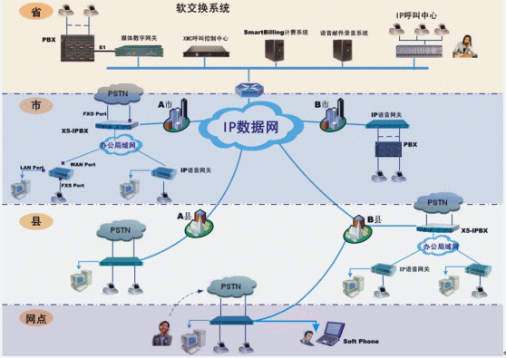 在各級辦公機(jī)構(gòu)根據(jù)原有用戶數(shù)量,可以配置IP電話綜合接入設(shè)備或IP-PBX,連接當(dāng)?shù)卦械霓k公電話環(huán)境(程控電話交換機(jī)、直線市話、電信虛擬網(wǎng)等)。實(shí)現(xiàn)機(jī)構(gòu)內(nèi)部辦公電話/傳真通過IP數(shù)據(jù)網(wǎng)通信。同時機(jī)構(gòu)以外的長途電話/傳真也可以利用IP電話網(wǎng)傳輸,而不產(chǎn)生任何長途通信費(fèi)用。