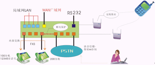 - 同時接入PSTN和專網(wǎng)電話,并在網(wǎng)關(guān)上實(shí)現(xiàn)內(nèi)部交換、語音信箱、和PSTN交換等功能