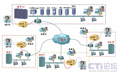 如上圖所示,由于Cisco IPCC是基于標(biāo)準(zhǔn)IP網(wǎng)絡(luò)的純IP呼叫中心解決方案,呼叫中心的核心設(shè)備都只部署在省中心機(jī)房,其它地市只需要在原有網(wǎng)絡(luò)的路由器上添加語(yǔ)音模塊即可實(shí)現(xiàn)PSTN語(yǔ)音的本地接入,而無(wú)需再各地市購(gòu)買(mǎi)額外的接入設(shè)備。而同樣由于IP網(wǎng)絡(luò)的特性,呼叫中心的坐席可以根據(jù)需要部署在甘肅省運(yùn)輸管理局IP網(wǎng)絡(luò)可達(dá)的任何一個(gè)地方,各地市的坐席只需要配備IP電話(huà)和座席PC即可。來(lái)自PSTN的電話(huà)根據(jù)用戶(hù)在IVR中的選擇和其它路由策略,自動(dòng)分配到最適合的坐席處理,譬如來(lái)自白銀的運(yùn)政投訴由白銀市本地的運(yùn)政大廳座席人員處理。