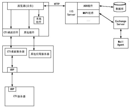 對于所有的電力業(yè)務(wù)模塊都是在IE瀏覽器上實(shí)現(xiàn),瀏覽器上的應(yīng)用模塊對WEB Server發(fā)出請求,WEB Server解釋運(yùn)行ASP程序,利用ASP創(chuàng)建數(shù)據(jù)庫組件訪問系統(tǒng)的數(shù)據(jù)庫信息;利用嵌入WEB頁面的CTI桌面控件可以實(shí)現(xiàn)CTI集成功能,如:建立呼叫、應(yīng)答呼叫、席間轉(zhuǎn)移、人工自動(dòng)切換等等;利用其他嵌入WEB網(wǎng)頁的組件實(shí)現(xiàn)其他擴(kuò)展功能,如:Exchange