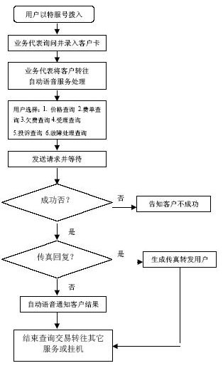系統(tǒng)自動(dòng)報(bào)受理人員工號(hào),人工交互式受理方式。受理人員根據(jù)用戶要求從服務(wù)質(zhì)量標(biāo)準(zhǔn)數(shù)據(jù)庫、電費(fèi)數(shù)據(jù)庫和其他相連的數(shù)據(jù)庫查詢資料,然后通過語音方式播報(bào)資料或送到用戶指定的傳真機(jī)或其他終端設(shè)備上。主要內(nèi)容如下: