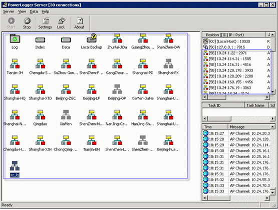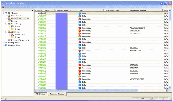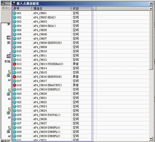 管理員通過(guò)管理員程序,遠(yuǎn)程登錄到中心點(diǎn)錄音服務(wù)器實(shí)時(shí)查看各個(gè)接入點(diǎn)的總體以及各個(gè)錄音通道的狀態(tài)