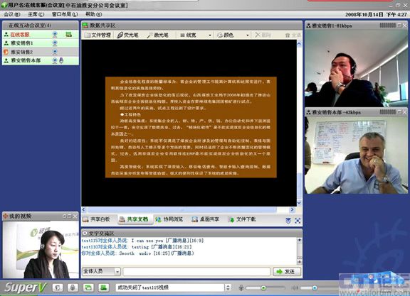 CTI論壇(ctiforum)05月19日消息: 自08年攜手視維Super-V視頻會(huì)議以來,中石油雅安分公司銷售部的日常工作會(huì)議高效及時(shí)地開展,尤其是在5.12四川大地震后,工作不但沒有中斷,而且足不出戶就可以給上級(jí)領(lǐng)導(dǎo)匯報(bào)工作,與同事交流營(yíng)銷心得。而在以前,只能通過電話或者郵件,甚至長(zhǎng)途跋涉聚集到一個(gè)地方舉行會(huì)議,既浪費(fèi)時(shí)間又增加營(yíng)銷成本。這是繼中國(guó)重汽、新加坡協(xié)美集團(tuán)等跨國(guó)集團(tuán)公司倡導(dǎo)信息時(shí)代新營(yíng)銷主義,實(shí)現(xiàn)高效運(yùn)營(yíng)的又一典型案例應(yīng)用。