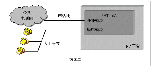 人工座席是呼叫中心(Call Center)一類應用的主要組成部分。三匯語音卡對人工座席提供了兩套解決方案:使用SHU系列座席卡,通過交換總線與其它卡互聯(lián),為整個系統(tǒng)提供座席資源。使用SHT系列模塊化語音卡,在部分通道使用座席模塊,可用單塊卡實現(xiàn)座席和外線系統(tǒng)。第二種方式特別適用于小型呼叫中心,總機話務員等應用。三匯公司的座席通道可以直接連接各類普通電話機,利用座席卡配置相應的軟件,還可以構成板卡交換機,完全取代企業(yè)用戶交換機。這類應用的典型結構如下圖: