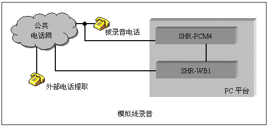 三匯公司的SHR系列監(jiān)控錄音卡可以實現(xiàn)對電話線路或其它信號源如話筒信號、對講機等進行錄音。模擬線錄音采用高阻抗并線的方式,對被錄音對象無影響?梢詸z測電話線上直流電壓、DTMF號碼、FSK/DTMF CallerId等信號。采用配套的高阻復接盒,SHD系列數(shù)字中繼卡還能完成對數(shù)字中繼線的監(jiān)控錄音,并能分析線路上的信令,從而取得通話狀態(tài)和主被叫號碼。這兩種錄音系統(tǒng)的結構如下圖: