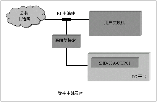 通道數(shù)較多的大中型應用系統(tǒng),一般采用數(shù)字中繼線(E1)接入公共電話網(wǎng),三匯公司的SHD系列數(shù)字中繼卡可以提供相應的解決方案。SHD系列數(shù)字中繼在一塊卡上集成了E1線接口,語音資源,信令處理等所必須的全部功能,其接入信令處理模塊可處理中國1號信令(SS1),7號信令(SS7),ISDN PRI協(xié)議(DSS1),單塊卡最多可支持4個E1接入。通過CT-BUS(或ST-BUS)總線,還可以在數(shù)字中繼線上實現(xiàn)傳真功能。典型應用結構如下圖:
