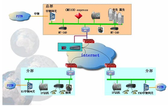由于電信運營商的線路租賃費用非常昂貴,對于中小企業(yè)來說是一項不小的負擔,所以中小企業(yè)的組網(wǎng)方式一般采用ADSL方式,來降低費用,而ADSL的組網(wǎng)方式往往都經(jīng)過了幾層地址轉換了,這樣在分部或分支機構的IP電話終端就無法穿透防火墻,實現(xiàn)和外面成功通話,所以需要在總部配置1臺媒體路由器(MR)來做語音代理,完成呼叫連接的建立。