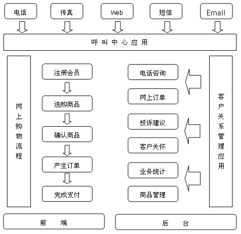 依照我公司的建設方向,中小型網(wǎng)上購物平臺的客戶服務呼叫中心系統(tǒng)應具備呼叫中心的基本功能,同時融入了網(wǎng)上購物的客戶關系管理(CRM)流程,因此,它是呼叫中心與CRM系統(tǒng)的有機結合體,包含電話咨詢、網(wǎng)上訂單、客戶關懷等主要功能層的應用。