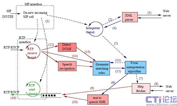 1. 當(dāng)瀏覽器接收到一個(gè)新進(jìn)來的SIP呼叫后,它創(chuàng)建三個(gè)不同線程:RTP接收線程、RTP發(fā)送線程和VoiceXML解釋器線程。RTP接收線程從主叫方接收媒體數(shù)據(jù)包并調(diào)用DTMF檢測(cè)模塊;RTP發(fā)送線程將媒體數(shù)據(jù)包以流的方式發(fā)送給主叫方。一個(gè)單獨(dú)的發(fā)送線程幫助維護(hù)外出數(shù)據(jù)報(bào)的固定帶寬(比如針對(duì)G.711音頻的64 kb/s),而不考慮語音合成速度。初始的VoiceXML頁面地址可以預(yù)先配置在瀏覽器中,或者編碼到SIP請(qǐng)求。例如,如果主叫方撥打sip:dialog.vxml.http%3a//dialogs.server.com/script32.vxml@vxmlservers.com,那么該呼叫將到達(dá)運(yùn)行在vxmlservers.com上的瀏覽器,然后從script32.vxml取得初始VoiceXML頁面。