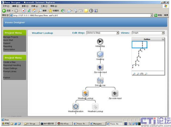 首先要做的是花一些時(shí)間前往http://cn.voxeo.com/prophecy/,免費(fèi)下載一個(gè)Prophecy 8.0。安裝完成后,會(huì)在系統(tǒng)托盤區(qū)生成一個(gè)Voxeo Prophecy v8.0.221.3圖標(biāo),選擇Prophecy Home,在打開的Voxeo Prophecy網(wǎng)頁中點(diǎn)擊Prophecy Designer即開始了我們創(chuàng)建VoiceXML項(xiàng)目的輕松之旅。該設(shè)計(jì)工具將整個(gè)VoiceXML應(yīng)用以圖表或樹狀結(jié)構(gòu)直觀地呈現(xiàn)給開發(fā)者,可以方便地控制和修改其交互流程,如圖3所示。