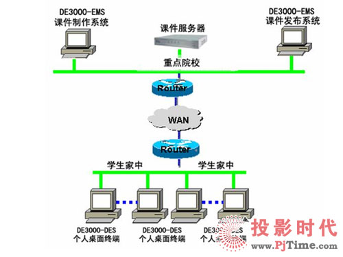 將全省各地市級(jí)院校與區(qū)縣級(jí)院;蛩搅⒃盒_B接起來,組成一個(gè)相對(duì)簡(jiǎn)單卻有效的遠(yuǎn)程教育網(wǎng)絡(luò),使教學(xué)水平相對(duì)落后地區(qū)的學(xué)生能方便地享用遠(yuǎn)程教育網(wǎng)所提供的優(yōu)秀教育資源,通過實(shí)時(shí)授課、課件學(xué)習(xí)等方式極大的方便學(xué)生學(xué)習(xí),提高成績(jī)?紤]到區(qū)縣級(jí)院校的教學(xué)水平和經(jīng)費(fèi)問題,可以在各地市級(jí)院校配置CNKaran的DE3000-UES遠(yuǎn)程教育產(chǎn)品。而在區(qū)縣級(jí)院校只配置一臺(tái)PC加攝象頭,來實(shí)現(xiàn)遠(yuǎn)程授課或遠(yuǎn)程教學(xué)培訓(xùn)。