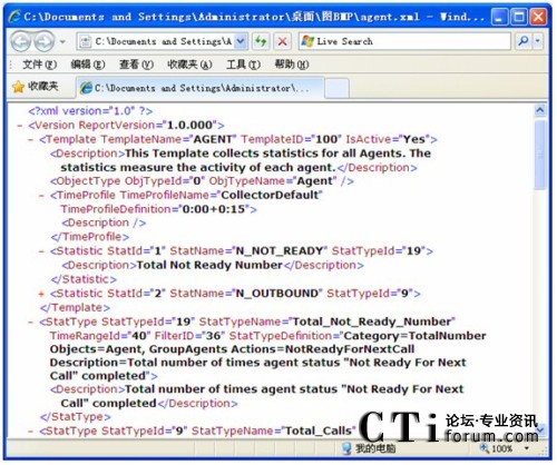 在模板導(dǎo)出的XML儲存圖中,ReportVersion屬性為報(bào)表系統(tǒng)的版本號。Template信息用來指定一個模板名字,給模板一個唯一的模板ID,再指定該模板是否激活,另外也為該模板添加了注釋。該例中是對所有坐席活動的數(shù)據(jù)進(jìn)行統(tǒng)計(jì)。ObjectType為模板的統(tǒng)計(jì)類型,該模板中統(tǒng)計(jì)類型為坐席(Agent)。TimeProfile為設(shè)定收集的時間間隔,本例中為從每天的0點(diǎn)0分開始,每隔15分鐘收集一次。Statistic對應(yīng)了一個統(tǒng)計(jì)內(nèi)容配置,根據(jù)StatTypeID在下面將列出詳細(xì)內(nèi)容。本例中StatTypeID為19,下面的StatType中將會根據(jù)StatTypeID與之相對應(yīng),其中配置了Category,