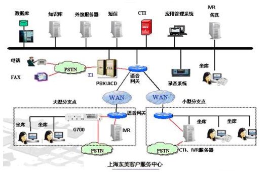 中心點(diǎn)和分支點(diǎn)的客服系統(tǒng)通過(guò)兩地的語(yǔ)音網(wǎng)關(guān)進(jìn)行語(yǔ)音連接,具體實(shí)現(xiàn)大概是,如果分支點(diǎn)需要把語(yǔ)音轉(zhuǎn)接到中心點(diǎn),分支點(diǎn)把TDM語(yǔ)音轉(zhuǎn)接到語(yǔ)音網(wǎng)關(guān),語(yǔ)音網(wǎng)關(guān)把TDM語(yǔ)音信號(hào)轉(zhuǎn)變?yōu)镮P包,通過(guò)網(wǎng)絡(luò)發(fā)送到中心點(diǎn)的語(yǔ)音網(wǎng)關(guān)上,語(yǔ)音網(wǎng)關(guān)把IP包變?yōu)門DM語(yǔ)音信號(hào),在接入到交換機(jī)上,由中心點(diǎn)CTI按照指定的策略轉(zhuǎn)接到最終目標(biāo)上。