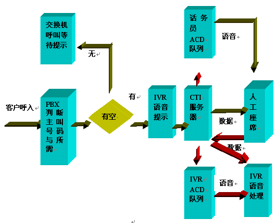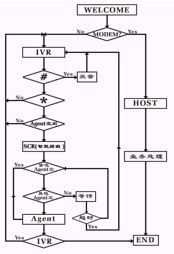 呼入一般都先通過ACD進(jìn)行排隊(duì),然后根據(jù)用戶選擇進(jìn)入子系統(tǒng),流程圖如下: