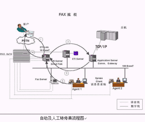 客戶致電CallCenter后,首先進(jìn)入IVR系統(tǒng),如圖箭頭1,當(dāng)客戶通過按鍵要求傳真服務(wù)時(shí),同時(shí)也會(huì)將傳真機(jī)置于傳真接收狀態(tài),IVR服務(wù)器收到傳真請求后,發(fā)送信息到Application Server,如圖箭頭2,Application Server準(zhǔn)備好傳真內(nèi)容,返回?cái)?shù)據(jù)包給IVR服務(wù)器,如圖箭頭3,由IVR發(fā)送傳真給客戶,如圖箭頭4。