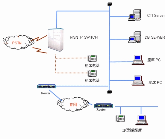 第一期工程,采用ISDN PRI信令接入方式,已上線24坐席運行。二期工程,單框可平滑升級擴容到348個坐席。