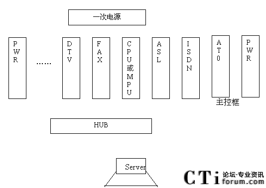 - CPU為256路主控板,對(duì)整個(gè)系統(tǒng)進(jìn)行主控,為整個(gè)系統(tǒng)提供時(shí)鐘入同步信號(hào)及交換網(wǎng),含一個(gè)10Base-T以太網(wǎng)口,通過HUB與Server進(jìn)行控制信息的交互