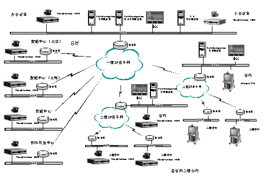 中國工商銀行此前已具備覆蓋一級分支機構的衛(wèi)星視頻會議系統(tǒng)和部分基于TCP/IP網(wǎng)絡的二級分支機構的H.323視頻會議系統(tǒng),并在此網(wǎng)絡中使用了包括寶利通在內的多家廠商的產品。但是,隨著機構業(yè)務的不斷擴大,原有系統(tǒng)已無法滿足目前的需要。而網(wǎng)絡技術的快速發(fā)展,使地面通訊線路的使用成本大幅降低,地面網(wǎng)絡的穩(wěn)定性、易維護性、帶寬可擴充性也使視頻會議系統(tǒng)的傳輸由傳統(tǒng)的較昂貴的衛(wèi)星專用信道轉向地面TCP/IP網(wǎng)絡成為大勢所趨。因此,工行決定在全行范圍內替換原有H.320視頻會議系統(tǒng),神州數(shù)碼應用網(wǎng)絡事業(yè)部基于中國工商銀行視頻會議系統(tǒng)特點采用TCP/IP網(wǎng)絡的H.323視頻會議系統(tǒng)。