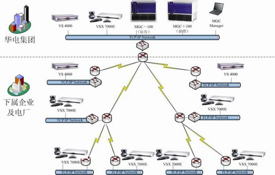 華電集團(tuán)領(lǐng)導(dǎo)十分重視電力信息化及華電集團(tuán)電子政務(wù)的建設(shè)工作。為了貫徹國(guó)務(wù)院對(duì)政府系統(tǒng)信息化建設(shè)的要求,實(shí)現(xiàn)華電集團(tuán)政務(wù)辦公和行業(yè)管理信息服務(wù)的電子化、網(wǎng)絡(luò)化,滿(mǎn)足華電集團(tuán)建立辦事高效、運(yùn)轉(zhuǎn)協(xié)調(diào)、行為規(guī)范的行政管理體制的要求,加快推進(jìn)電力行業(yè)信息化建設(shè),華電集團(tuán)決定開(kāi)展華電集團(tuán)信息化建設(shè)二期工程建設(shè),即在現(xiàn)有的基礎(chǔ)上再增加一臺(tái)MCU以及在下屬企業(yè)及電廠增加37臺(tái)終端。鑒于POLYCOM在視頻會(huì)議強(qiáng)大的技術(shù)優(yōu)勢(shì)以及神州數(shù)碼在視頻會(huì)議系統(tǒng)建設(shè)和實(shí)施上的雄厚實(shí)力和豐富經(jīng)驗(yàn),華電集團(tuán)決定包括MCU和終端的所有設(shè)備都采用POLYCOM的產(chǎn)品。整個(gè)系統(tǒng)主要建立在華電集團(tuán)現(xiàn)有的視頻會(huì)議的基礎(chǔ)之上,依據(jù)H.323標(biāo)準(zhǔn)協(xié)議建設(shè)視頻會(huì)議系統(tǒng)二期組網(wǎng)。其中,控制中心新增一臺(tái)POLYCOM公司的MGC+100多點(diǎn)控制單元(即MCU);POLYCOM 高性能的VSX7000E作為下屬企業(yè)及電廠主接點(diǎn)視頻會(huì)議終端。