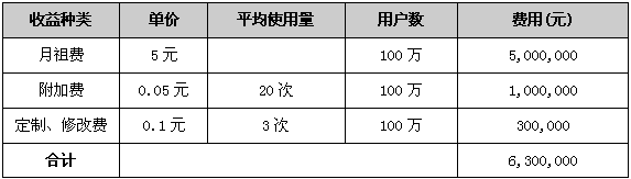 根據(jù)以上所述,假如用戶數(shù)為100萬(wàn),CRBT月租費(fèi)為5元,并提供20次的免費(fèi)呼叫,之上每次呼叫收取0.05元假若每月附加呼叫為平均20次,即每月用戶平均收到40次呼叫。且每用戶每月至少定制或修改三條CRBT,每次收費(fèi)0.1元。