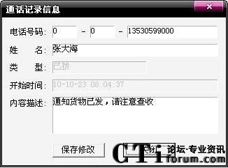 在A8電腦傳真機(jī)的電話商務(wù)通軟件主界面,雙擊通話記錄中的某個(gè)客戶(hù)號(hào)碼,或選中該號(hào)碼點(diǎn)擊下面的通話歷史按鈕,您與該客戶(hù)的通話歷史便一覽無(wú)余。選中某個(gè)記錄,您可以對(duì)其進(jìn)行編輯(添加姓名、備注該次通話的內(nèi)容),刪除,軟件撥出,加入電話簿等操作。