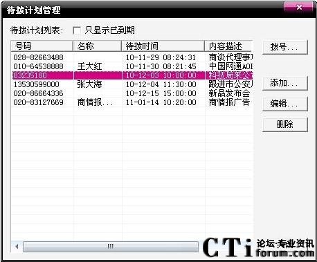 A8電腦傳真機(jī)的通話記錄和通話歷史讓您記住過(guò)去,來(lái)電彈屏和自動(dòng)答錄助您處理現(xiàn)在,待撥計(jì)劃和到時(shí)提醒則幫您安排未來(lái)。點(diǎn)擊電話商務(wù)通主界面中的待撥計(jì)劃按鈕,出現(xiàn)您未來(lái)將要撥出電話的日程安排,您可以對(duì)其進(jìn)行添加、編輯和刪除等操作。時(shí)間一到A8電腦傳真機(jī)會(huì)自動(dòng)彈屏提醒,待撥計(jì)劃中的電話一經(jīng)撥出,A8會(huì)自動(dòng)刪除該電話號(hào)碼。