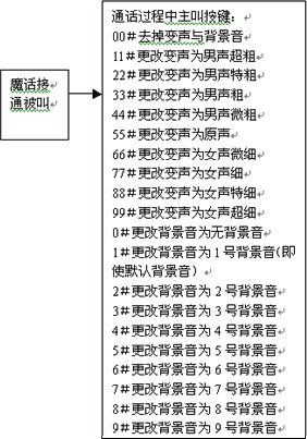 變聲通話功能也叫魔話功能,是指用戶通過通過播打特殊的號碼接入到本平臺后,再通過本平臺去呼叫最終的被叫用戶,在這樣的一個通話過程中,可以通過本平臺提供8級變聲和原聲功能:“男聲超粗、男聲特粗、男聲粗、男聲微粗、原聲、女聲微細、女聲細、女聲特細、女聲超細”。在通話過程中實時變聲,并可按鍵選擇改變變聲系數(shù)或恢復(fù)原聲,趣味非凡,超常體驗。