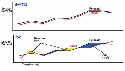 下一代網(wǎng)絡(luò)的IP化、智能化的趨勢,使得服務(wù)路徑從靜態(tài)路由為主向動態(tài)化、共享化轉(zhuǎn)變。這種轉(zhuǎn)變使得主動的網(wǎng)絡(luò)容量規(guī)劃在下一代運(yùn)營環(huán)境中具有更加重要的意義。準(zhǔn)確、真實、主動的網(wǎng)絡(luò)容量計劃和趨勢分析能力將成為對OSS解決方案的關(guān)鍵需求。網(wǎng)絡(luò)規(guī)劃不僅可以幫助運(yùn)營商準(zhǔn)確分配網(wǎng)絡(luò)容量,而且可以減少容量不足和失敗訂單,并可通過找出利用率不足的網(wǎng)絡(luò)資源來提高網(wǎng)絡(luò)運(yùn)行效率,如圖3所示。